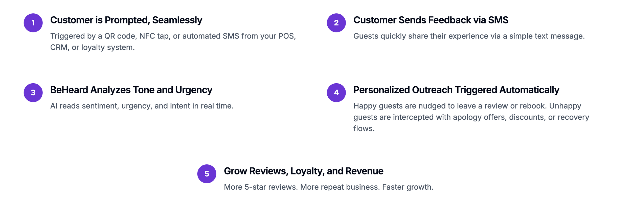 Turn Customer Feedback into Revenue, in Real Time BeHeard captures feedback, analyzes emotion, and triggers personalized follow-up all through SMS. No portals. No apps. Just action. Book a Demo Capture, Analyze, Act How It Works Tailored For Your Business Your Customers Are Talking. Start Turning Every Word Into Revenue. Book a Demo